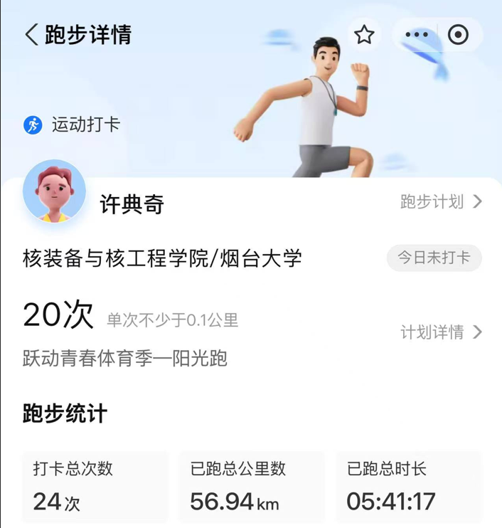纵有疾风起,人生不言弃,在霄壤嬗变的环境下,我认为只有强风才能吹拂我躁动的心。从一开始的扭捏不安只求一处发泄,到如今的随心所欲不逾矩,我也从跑步中懂得一些道理:人生没有那么多观众,也没有那么多如果,只有踏实的进步是自己的,不看装备,不追配速,只求心跳,快是别人的剧本,燃是自己的勋章。跑步成为我的热爱时,我再不知外界烦恼,我只单纯想着pb,状态不好可以奖励自己再慢一点,状态好跑步就更为享受了。尽管一开始还是哄着自己开始,哄着自己达成下一个目标,但只要迈出第一步,只想跑到跑不动为止,任何人都可以做的到,只是缺一个驱动力。还有跑步可以不是一个人的孤独,也可以是一群人的身体共舞,心灵共鸣,快带上你的舍友小伙伴参加校园跑吧。